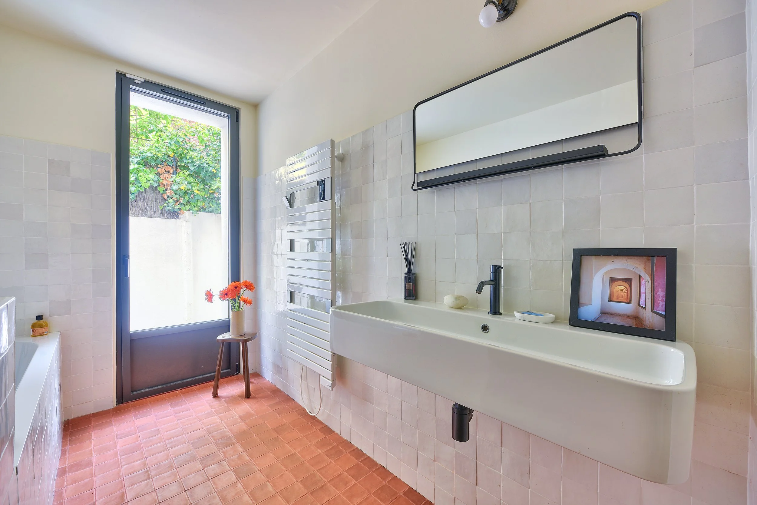 La fenêtre guillotine sur toute la largeur, les mosaïques encore d’origine, et la végétation omniprésente offrent une athmosphère unique propice aux moments de création, réflexion et respiration.